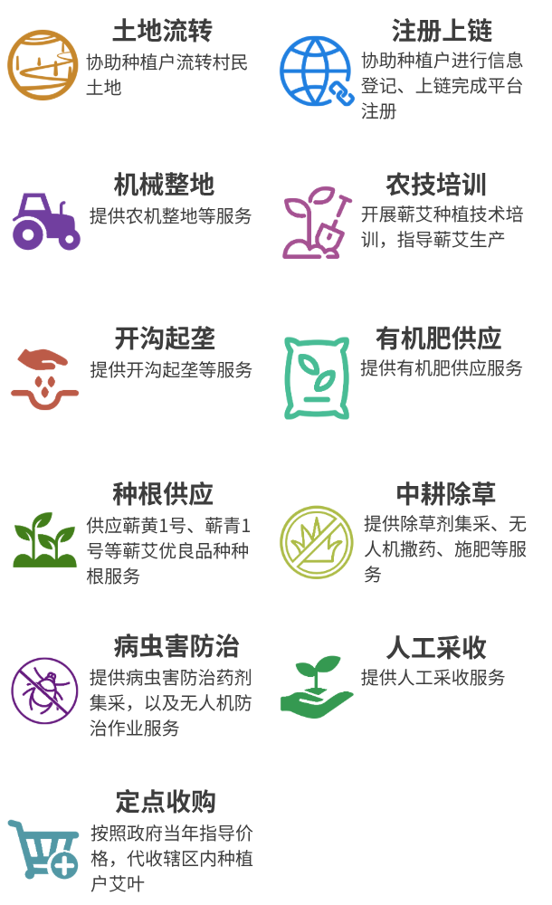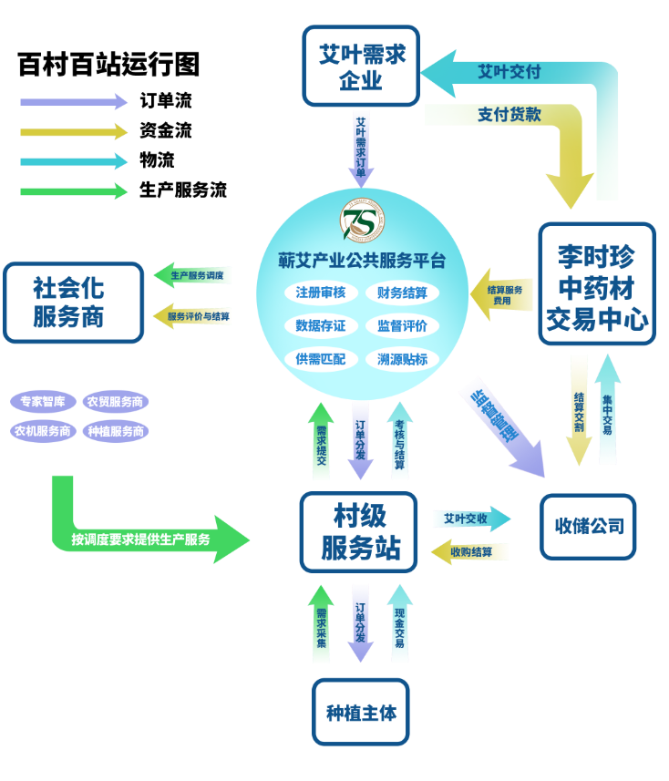 “百村百站”是7S蕲艾产业公共服务平台服务种植端的关键抓手与支点,充分发挥平台的组织优势,整合农资农技、农技等专业化服务资源,依托订单种植和统一收储机制,精准链接艾农生产需求与平台服务资源供给,保障艾农收益,助力蕲艾品牌化建设。