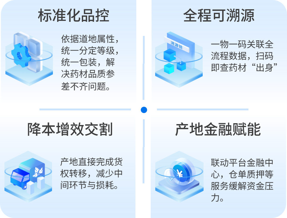 依据道地属性,统一分定等级,统一包装,解决药材品质参差不齐问题。